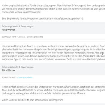 Als Gründerin von Strong CEO helfe ich Unternehmern, Geschäftsführern und Führungskräften, in nur 12 Wochen ihr volles Potenzial zu entfalten – körperlich, mental und beruflich. In meinem exklusiven one to one Coaching kombiniere ich Strategie, Umsetzung und nachhaltige Performance, ganz ohne Ausreden. Ob 60+ Stunden Wochen, Geschäftsreisen oder hohe Verantwortung: Ich biete maßgeschneiderte Lösungen, die sich in jedes anspruchsvolle Business-Leben integrieren lassen – mit 100 % Fokus auf Umsetzung und Erfolg. Persönliches High Performance Coaching Individuell und unternehmerspezifisch Zeit-effizient und ergebnisorientiert Mein Coaching ist keine Theorie, sondern klare Transformation; für Unternehmer, die keine Zeit verlieren wollen. Als Physiotherapeutin und Coachin unterstütze ich Frauen und Männer , zu einem neuen Lebensgefühl. Weg vom Scham in hübscher Kleidung, Frust durch Gewichtszunahme und JoJo-Effekt, Angst vor unkontrollierten Fressanfällen. Hin zu Genuss, ihren Wohlfühlkörper den sie zeigen und nicht verstecken möchten. strongceo.de alicewerner.de