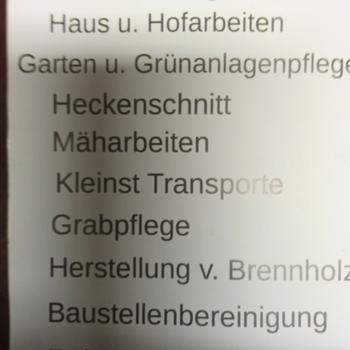 Ich übernehme preisgünstig und zuverlässig ihre gartenarbeiten Mäharbeiten so wie Freischneider arbeiten Heckenschnitt und auch die Beseitigung des Schnittgrüns! Mehr Dienstleistungen und arbeiten auf Anfrage! Mein Stundenlohn beträgt 35 € je Stunde plus 25 € für die Anfahrtskosten! Gerne übernehme ich auch andere arbeiten für sie wie z.b den Transport von kleinen Möbeln bis maximal 2 m Länge und sonstige kleinsttransporte sowie entrümpelung der Wohnung oder Haus! Sie können bei mir per Karte bar oder auf Rechnung bezahlen! Für die Barzahlung erhalten sie selbstverständlich eine Quittung!