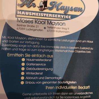 Mr.Mayson, steht Ihnen für sämtliche Leistungen rund um Haus zur Verfügung. Zuverlässig sorge ich dafür ihre Immobilie stets in bestem Zustand zu halten und trage so zum langfristigen werterhalt ihres Objektes bei. * Gebäudereiningung. Ihren individuellen Bedarf! Gerne unterbreite ich Ihnen dann ein unverbindliches und selbstverständlich für Sie kostenloses Angebot. Kontaktieren und testen Sie mich!