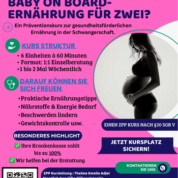 Bei YOU FIRST- Praxis für Ernährungsberatung stehen Sie als Mensch mit Ihren individuellen Bedürfnissen im Fokus. Ich biete keine pauschalen Lösungen, sondern persönliche Beratung und Begleitung – einfühlsam, alltagstauglich und fundiert. Ob Sie sich gesünder ernähren möchten, Gewicht reduzieren wollen oder Unterstützung bei Diabetes, Bluthochdruck oder anderen ernährungsbedingten Beschwerden suchen – ich begleite Sie Schritt für Schritt, ehrlich, motivierend und auf Augenhöhe. Mein selbst entwickelter Präventionskurs „Baby on Board – Ernährung in der Schwangerschaft“ kürzlich von der Zentrale Prüfstelle Prävention (ZPP) nach § 20 SGB V zertifiziert wurde. Andere Präventionskurse befinden sich aktuell im Zertifizierungsprozess (ZPP), sodass eine Kostenübernahme bis zu 100 Prozent durch die Krankenkasse bald möglich sein wird. Wenn Sie eine Ernährungsexpertin suchen, die mit Herz, Struktur und fachlicher Kompetenz arbeitet, dann sind Sie bei mir genau richtig. Ich biete ein 15 Minuten Kostenloses erst Gespräch an, was ihnen die Möglichkeit bietet mich und meine Arbeitsweise ganz unverbindlich kennenzulernen.
